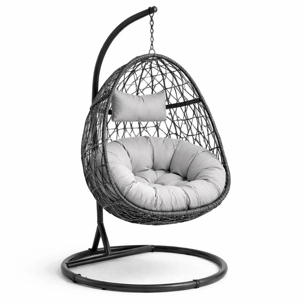 Material: Geflecht aus wetterfestem PE-Rattan, Gestell aus pulverbeschichtetem Stahl, Kissenbezug aus Polyester