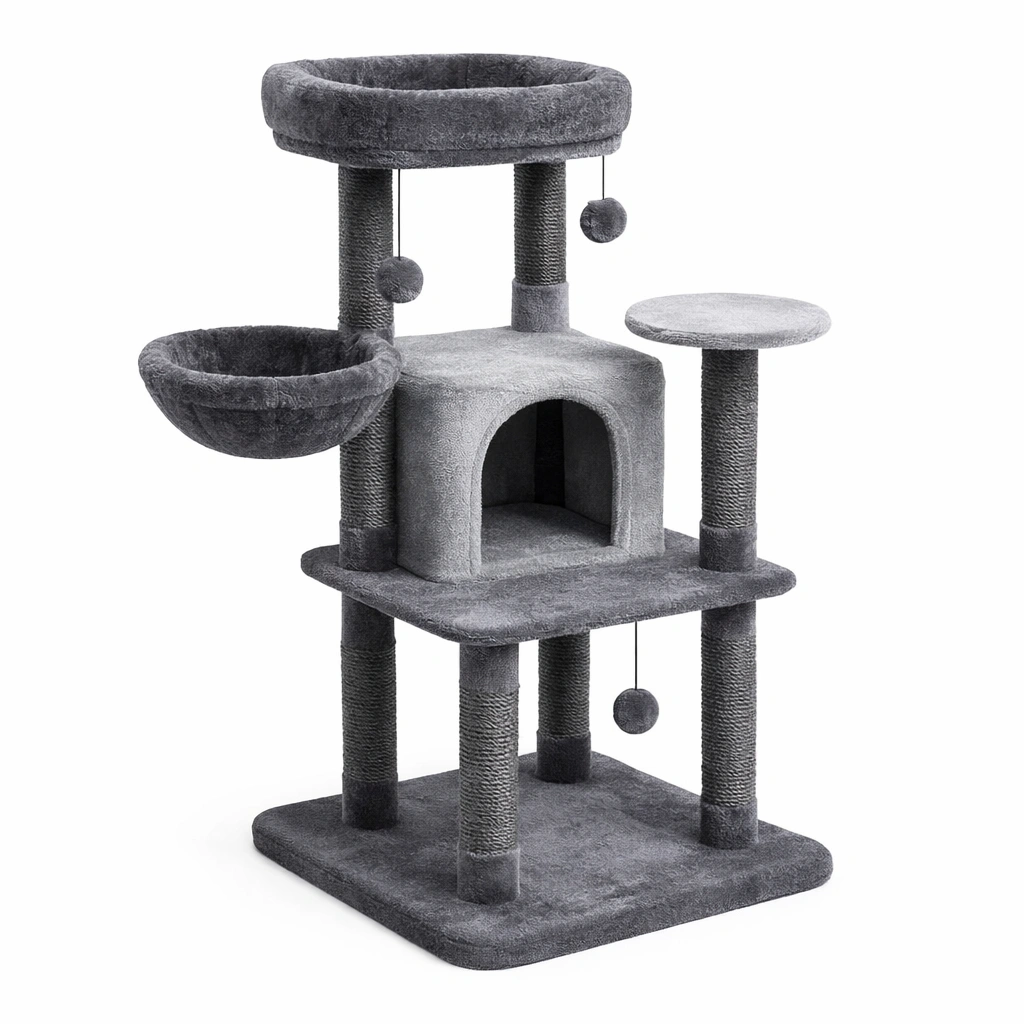 Der Kratzbaum besteht aus weichem Polyester-Plüsch und robusten Sisalseilen, ideal zum Klettern, Spielen und Entspannen. Er umfasst eine Kuschelhöhle, eine Hängematte, Sisalseil-Kratzstangen und hängende Bälle.