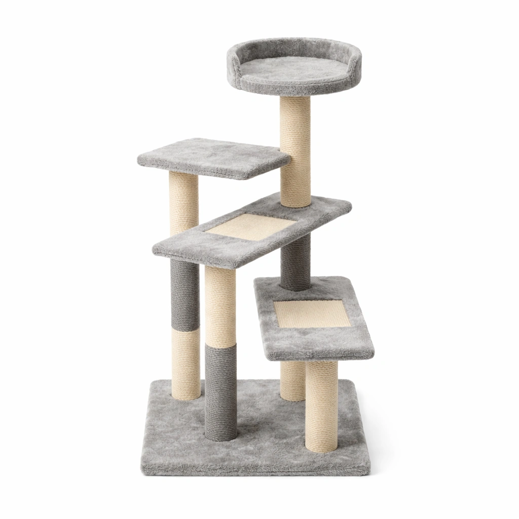 Der Kratzbaum besteht aus stabilen Stämmen, die mit Sisalseilen umwickelt sind, und weichen Plattformen mit einem Plüschbezug. Die Gesamthöhe beträgt 130 cm, mit Plattformen von ca. 30 cm x 30 cm und einer Basis von ca. 50 cm x 40 cm. Die Hauptfarbe ist Grau mit Akzenten in Beige. Der Kratzbaum ist für den Innenbereich vorgesehen und für Katzen geeignet.